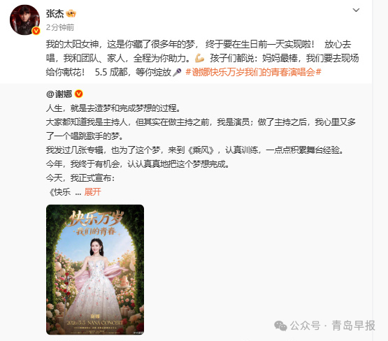 4月12日,张杰发文力挺谢娜:我的太阳女神,这是你藏了很多年的梦, 终于要在生日前一天实现啦!放心去唱,我和团队、家人,全程为你助力。孩子们都说:妈妈最棒,我们要去现场给你献花!