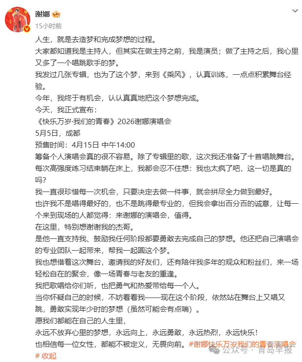 4月11日,谢娜在《乘风2026》直播中宣布将开演唱会。随后,她在微博发长文:筹备个人演唱会真的很不容易。除了专辑里的歌,这次我还准备了十首唱跳舞台(作品)。也许我不是唱得最好的,也不是跳得最专业的,但我会拿出百分百的诚意,让每一个来到现场的人都觉得:来谢娜的演唱会,值得。