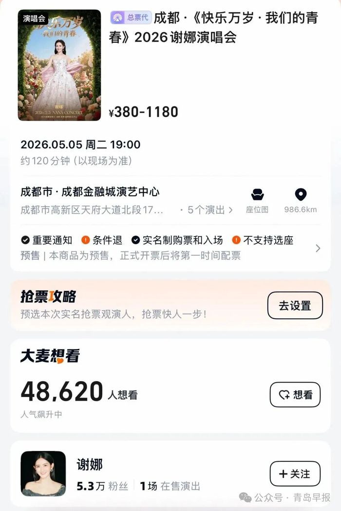 据极目新闻,记者注意到,谢娜个人演唱会成都站截至发稿时想看人数已超4.8万,票价380元至1180元不等。据悉,谢娜曾在2月的直播中表示:“我那些歌也要拿出来见人了。”