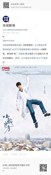 在爱奇艺与央视双平台预约量 突破75万,连续多日稳居待播剧期待榜前十;肖战三部待播剧(含《小城良方》)总预约量 突破268万,持续刷新行业数据。