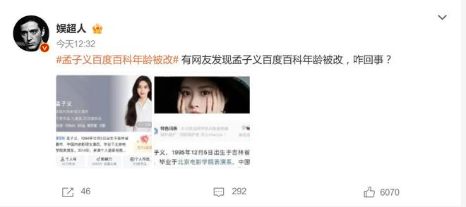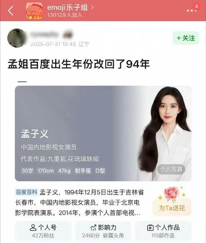 事件一出,粉丝火速晒出多方证据:北影校花评选报道、早期综艺资料、各平台官方认证均显示孟子义真实出生日期为1995年12月5日。尽管有网友翻出“早年百科曾显示1994年”的旧账,但粉丝澄清这是首次遭遇恶意篡改,此前从未有过年龄争议。