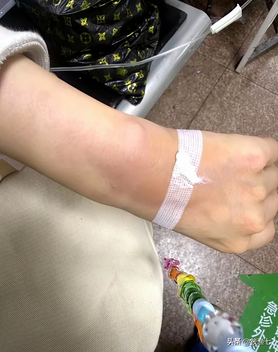 王晓晨吃了不合适的药,引发了心悸,所以去打点滴,打点滴枕头刺破血管是必须的,到王晓晨的手又肿了起来,一系列的文案好像就述说自己没有人陪,一个人承受了所有。