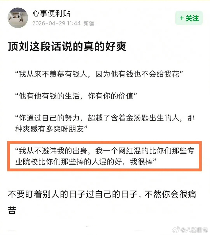 刘宇宁直播说从不避讳自己的出身,“我一个网红混的比你们那些专业院校的都好,我很棒”
