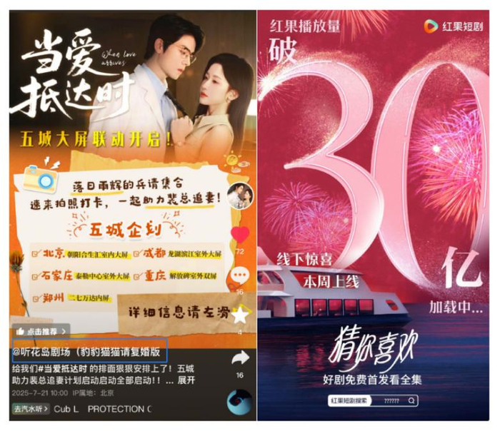 再次,短剧CP逐渐不满足于剧内多搭、线上直播等方式,而是通过多种方式释放影响力。7月中下旬,《当爱抵达时》热播,“落日雨辉”现在五城大屏联动拍照打卡的活动,也在轰轰烈烈展开;《念念有词》的邮轮庆功会,更是将接新娘、喷彩带、香槟蛋糕礼服等“接亲流程”玩了个遍。