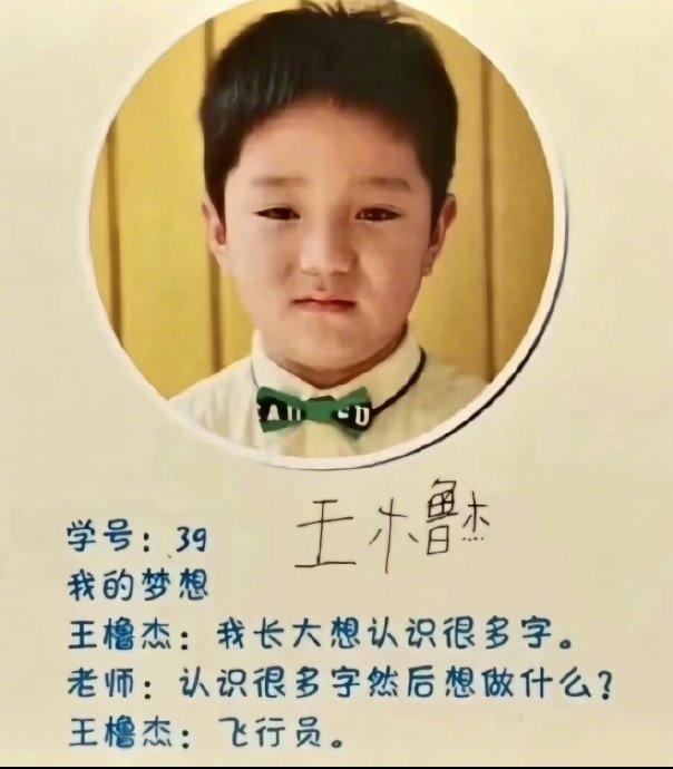 在小学简介中,王橹杰明确写道:“我长大想认识很多字”,老师追问原因时,他回答“为了当飞行员”。这一梦想既展现了孩子对知识的好奇,又隐含了职业理想,形成反差萌点。