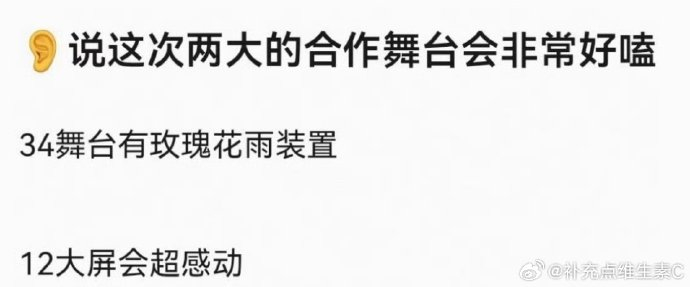 双人舞台以杨丞琳经典情歌为基底,马嘉祺清透声线与丁程鑫温柔和声交织,搭配英文RAP段落和即兴走位设计。舞台将启用玫瑰花雨装置与情感叙事大屏,打造“温柔中蕴含力量”的沉浸式氛围。