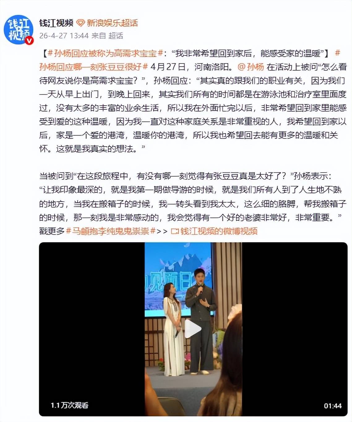 节目中,孙杨被镜头捕捉到频繁向妻子张豆豆索要夸赞、因小事闹情绪、集合迟到推卸责任,甚至不顾预算执意购买纪念品。这些细节被网友逐帧放大,吐槽声浪一波接一波。有人直言“低情商叫妈宝男,高情商叫高需求宝宝”。面对全网围观的“拆解”,4月27日,孙杨在活动上正面回应了这场争议。