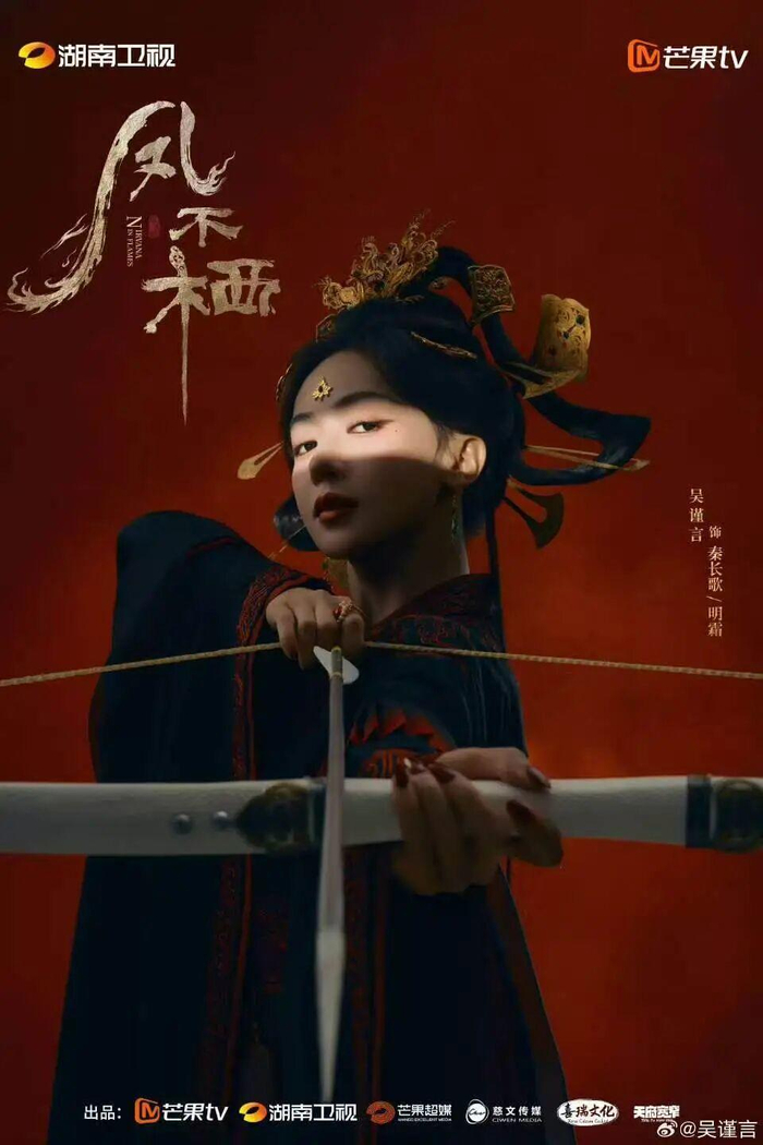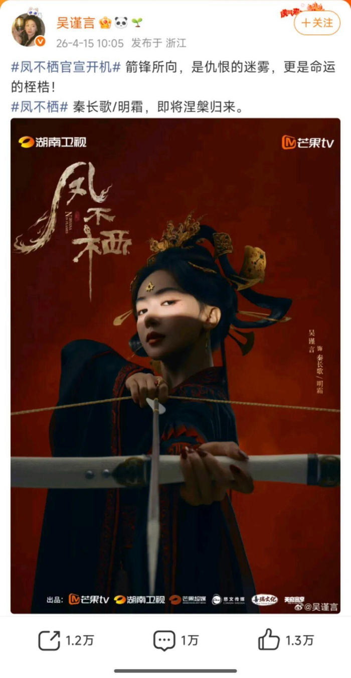 4月15日,女演员吴谨言宣布电视剧《凤不栖》今日正式开机,并晒出了官宣海报,吴谨言身穿华丽宫服,手拿弓箭。