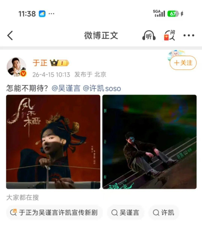 4月15日,于正为吴谨言宣传新剧 ,发文:怎能不期待?
