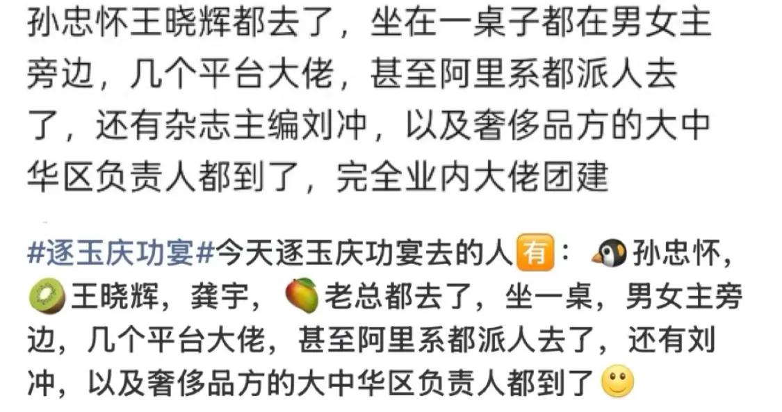 张凌赫和田曦薇被安排在庆功宴的主桌,张凌赫的身边坐着孙忠怀和王娟,爱奇艺的龚宇也坐在这桌,这一桌的含金量太高了。业内大佬们都来给《逐玉》庆功,张凌赫太有面子了。