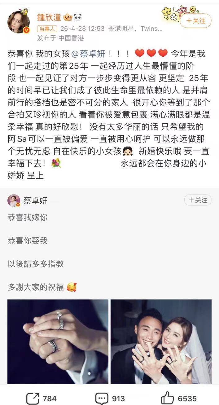 好姐妹钟欣潼也为阿sa送上祝福,她们组合已经25年,彼此见证对方的成长变化,看到对方更加从容和坚定,25年的时间让她们都成为最依赖的人,是并肩前行的搭档,也是密不可分的家人,很开心她等到了那个合拍又珍视她的人,看着被爱包裹,满心满眼都是温柔幸福,真的好欣慰。没有太多华丽的话,只希望阿sa可以一直被偏爱,一直被用心呵护,可以永远做那个无忧无虑自在快乐的小女孩,新婚快乐!要一直幸福下去,永远都会在你身边的小娇娇。