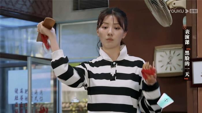 为了快速进入情绪,王鹤润课前就开始酝酿,在房间里快速调整情绪和表情,入戏后的情绪也间接感染带动了其他演员。这股烦躁的情绪在课堂上集中爆发,表演刚开始,王鹤润手拿快板站上椅子,独特的出场方式让她在气势上增添一份压制感,接下来的表演中,王鹤润作为一名演员,抓住了平时观察生活中是细微瞬间——越是烦躁就越容易出错。利用快板将黑脸情绪全部展现,节奏和情绪十分到位。一鼓作气流畅表演向观众传递了情绪上的黑脸。