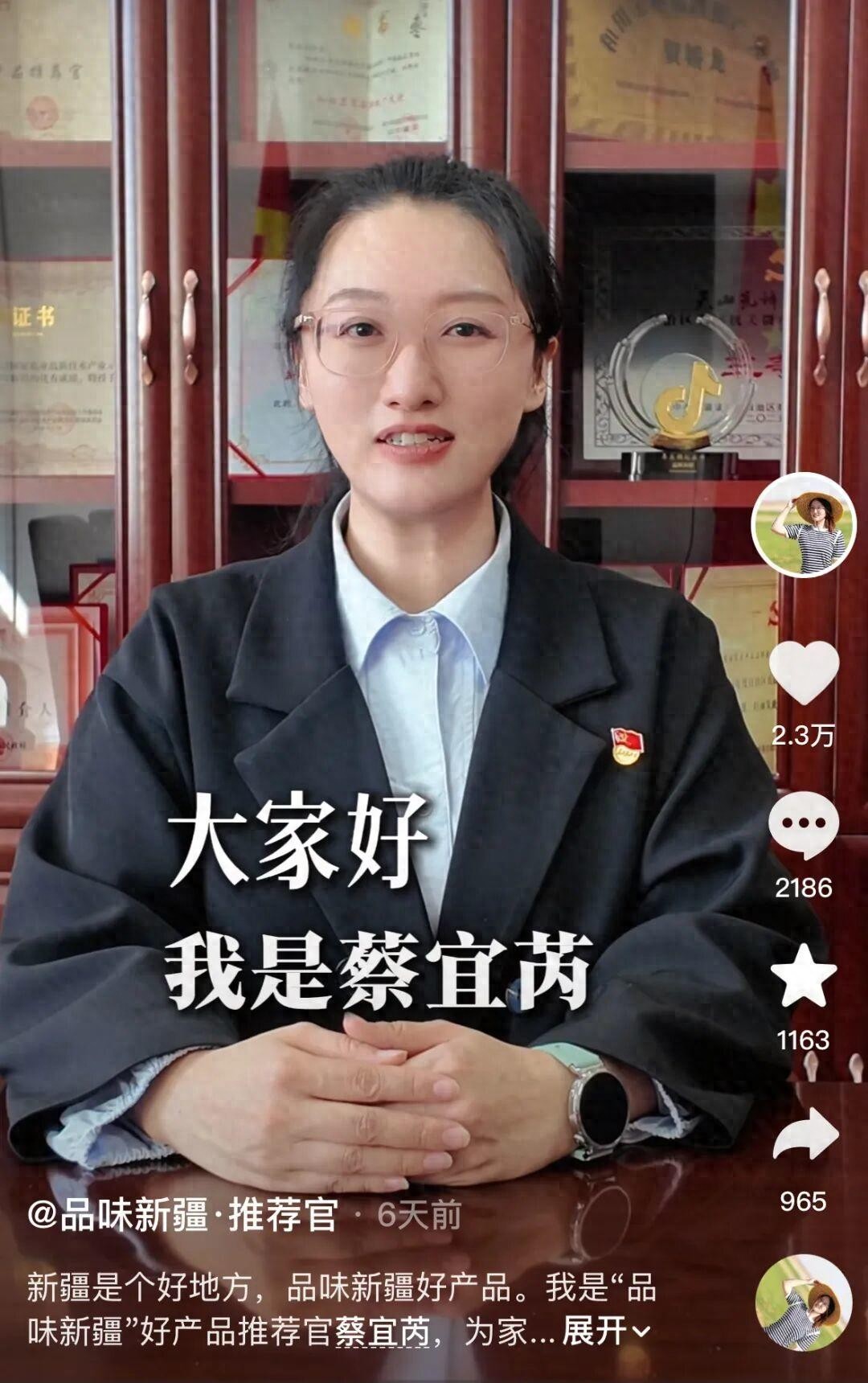 “大家好!我是蔡宜芮,来自新疆维吾尔自治区农业农村厅。从今天起,我会在‘品味新疆·推荐官’这个账号,陪大家一起认识真正的新疆地道农特产……”