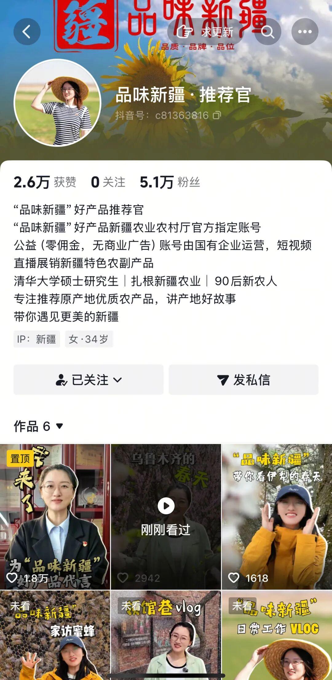 清华大学硕士研究生,扎根新疆农业,“90后”新农人……账号简介中如此介绍她的个人情况。