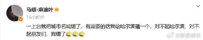 随后,马頔再次在社交平台上发文道歉:“一上台就把城市名喊错了,有需要的话我给哈尔滨磕一个,对不起哈尔滨,对不起朋友们,我错了!”