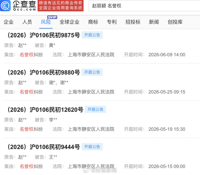 【#赵丽颖多起名誉权维权案将开庭#】#赵丽颖诉多方名誉侵权#企查查APP显示,近日,@赵丽颖 分别与王某、李某、谢某等新增开庭公告,原告为赵丽颖,案件案由均为名誉权纠纷,上述案件将分别于5月、6月开庭审理。 #赵丽颖林更新楚乔传百指#