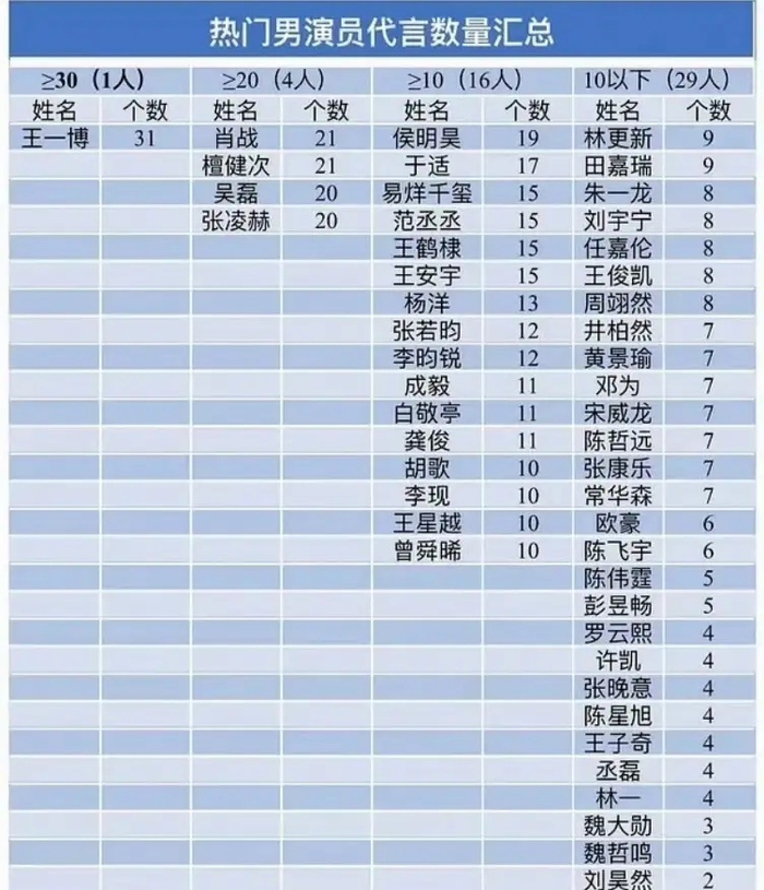 杨洋:13个 张若昀:12个 李昀锐:12个 成毅:11个 白敬亭:11个 龚俊:11个 胡歌:10个