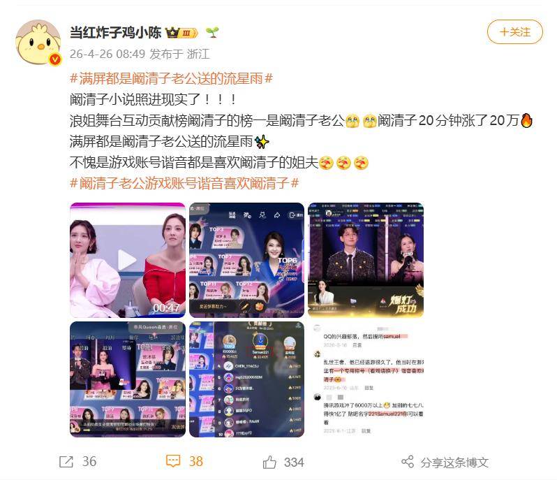 据网友4月26日爆料,《乘风2026》的直播夜,正当大家还在为姐姐们的舞台表现刷屏时,一场突如其来的“流星雨”直接让直播间特效炸裂——阚清子的丈夫周浩,以账号“Samuel221”的身份高调现身,在互动环节狂刷单价5200元的虚拟礼物“流星雨”,短短20分钟内,硬生生将阚清子的乘风值从几百名开外直接推到了20万的断层TOP1。