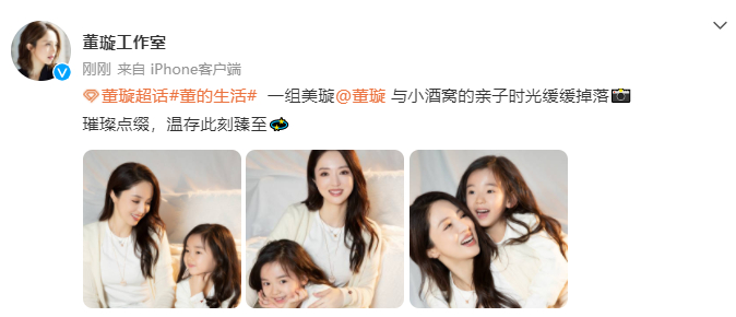 12月14日,董璇工作室在网上晒出一组董璇与女儿小酒窝最新拍摄的亲子写真,发文写道:“一组美璇她与小酒窝的亲子时光缓缓掉落,璀璨点缀,温存此刻臻至”。