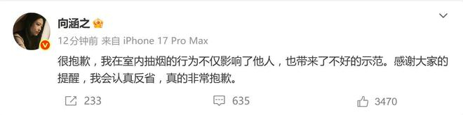 事件曝光后,向涵之没有选择沉默或辩解,而是迅速在微博发布了道歉声明。她在声明中直接承认:“我在室内抽烟的行为不仅影响了他人,也带来了不好的示范。”这句话精准点出了事件的两个核心争议点:一是对周围人健康的实际影响,二是作为公众人物所产生的不良示范效应。她同时感谢了外界的提醒,并用“认真反省”、“很抱歉”、“真的非常抱歉”等措辞反复表达了悔意。