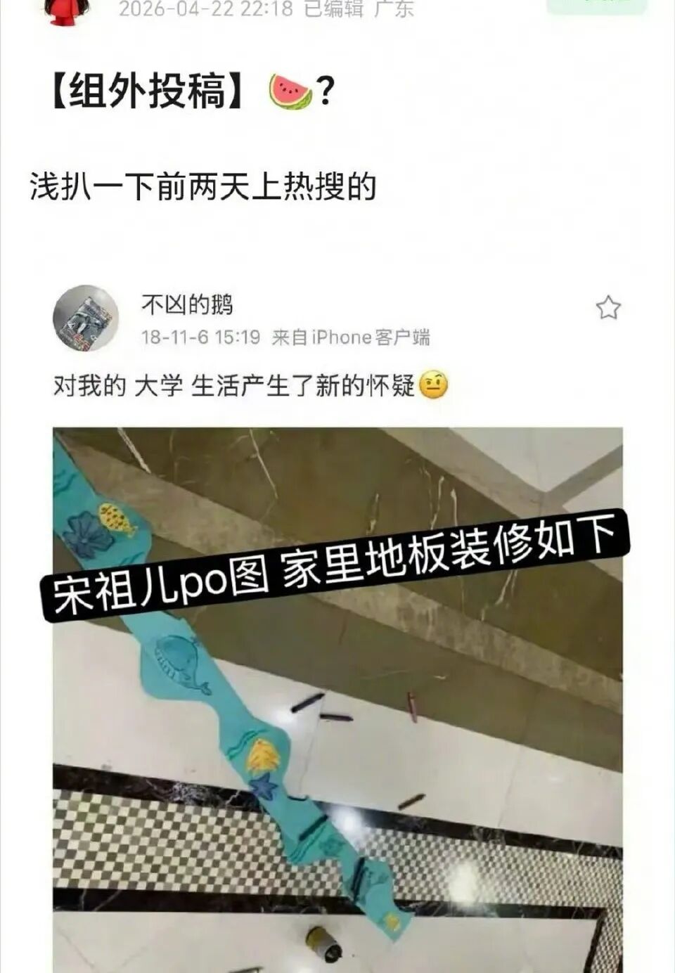 有网友发现刘宇宁2023年发布的一段居家逗狗视频,和宋祖儿2018年晒出的一张家居照中地板的纹路相似。