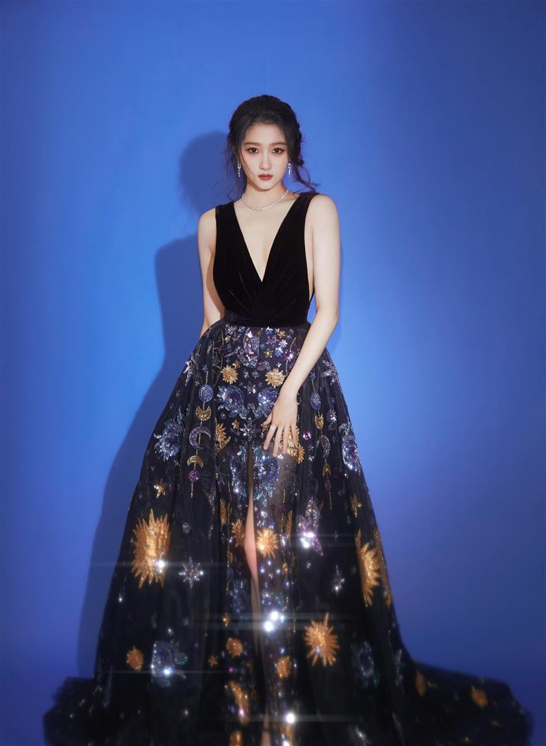 在光影交织的红毯上,关晓彤以一袭Maison Chahad定制星空黑裙惊艳亮相,仿佛将浩瀚宇宙披于一身。金箔绣制的太阳与银闪点缀的星月在黑色网纱裙摆上流转,走动间如星河倾泻,既浪漫又充满力量感。这件礼服不仅是视觉盛宴,更成为高个子女性礼服穿搭的典范之作。