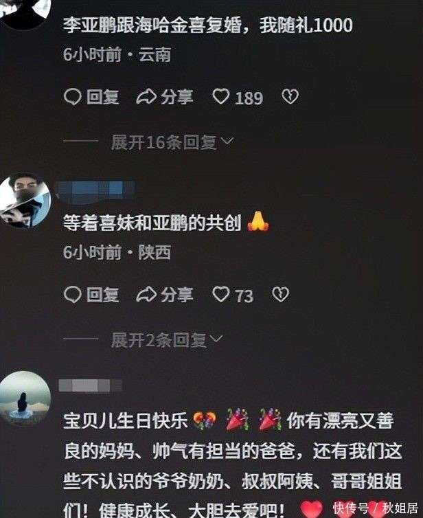 ,1. **甜甜圈**:李亚鹏带娃参加生日,真是贴心!看来真爱从来都不是因为离婚,而是因为共同的初心和责任啊!,2. **萌萌派大主席**:原来离婚了也能保持这么温馨的相处,真心头疼啊,孩子们真的好幸运!,3. **吃瓜小天使**:夏夏的生日这么温馨,父母的爱总是跨越时间和空间,孩子真的会被这种爱感染!,4. **小橘子不酸**:海哈金喜和李亚鹏的相处方式,简直是娱乐圈里最给力的一对父母!孩子真的会受他们的爱影响很大!,5. **爱吃糖的糖糖**:生日烛光被点亮,夏夏一定开心得飞起!愿她永远都保持这种幸福感!,6. **草莓味的奇葩**:离婚了还能保持这么默契的相处,真心头疼!这种亲情在娱乐圈是不是特别难见?,7. **柠檬不甜**:李亚鹏和海哈金喜的故事,证明了亲情的力量真的从来都不是因为婚姻的存在与否,而是因为双方的选择和责任感!,8. **星星小爱**:夏夏的生日记录让人感动,父母的爱从来都没有因为离婚而改变,孩子真的会感受到那么多温暖!,9. **吃瓜大师**:海哈金喜和李亚鹏的相处方式,真是给了单亲家庭一个全新的样板!愿夏夏能在这样的环境下健康成长!,10. **草莓味的奇葩2**:生日记录里没有矛盾,只有爱,这种爱真的值得被传递下去!愿夏夏永远都能感受到父母的爱!,1. **默契王夫** , 李亚鹏来点生日烛光,离婚也没影响,默契还在!真心实意,感动到了。,2. **演技在线** , 看来离婚没影响李亚鹏的演技,点生日烛光一看,还是那个人。,3. **亲子爱** , 夏夏可爱,爸爸也很贴心,离婚后的亲子关系这么好,真是让人羡慕。,4. **王夫荣誉** , 李亚鹏和海哈金喜离婚后相处这么好,堪称王夫荣誉领军!,5. **暗恋一生** , 看了这组合,真心暗恋一生,离婚也不影响他们的默契。,6. **高手相处** , 他们离婚后相处这么高手,原来单亲家庭也能这么幸福。,7. **互相尊重** , 互相尊重的离婚,孩子才会这么幸福,真心给点赞!,8. **真爱不变** , 离婚了却还保持真爱,真是难得的爱情,不因婚姻而褪色。,9. **家庭幸福** , 无论婚姻如何,孩子都是幸福的源泉,看来他们家庭真的很幸福。,10. **离婚也没影响** , 离婚也没影响他们的亲情,孩子永远是他们共同的初心。