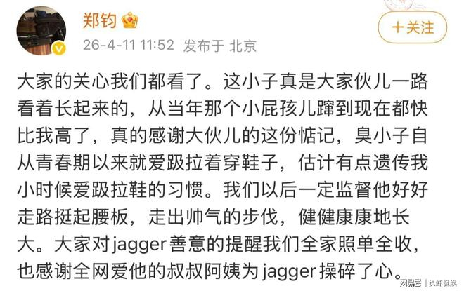 网友对于jagger走路姿势的讨论,郑钧也知道没有恶意,外界善意地提醒他们照单全收,也感谢全网爱jagger的叔叔阿姨,为jagger操碎了心。