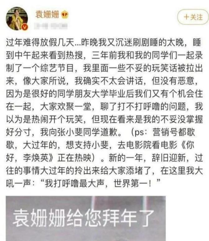 真正让事情发酵的,是2021年。张小斐凭借《你好,李焕英》一夜爆红,票房破50亿,成了国民妈妈。就在这个节骨眼上,袁姗姗突然翻出三年前的旧账,发长文向张小斐道歉,最后还加了一句“我打呼噜最大声,世界第一”。