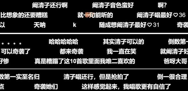 阚清子这次真的有点惨,自己本身就不是专业唱跳出身,还碰上了两个大白嗓队友,上台的时候全员都拿着歌词,观感上就差点意思。温峥嵘全程不在调上,张艺上一副没睡醒的样子,唱出来跟朗诵没差,网友都辣评“比想象中还要糟糕”。没想到全组居然是阚清子唱得最好,好歹不跑调还有不错的音色,就是肺活量差点意思,不少网友都心疼姐姐命不好,摊上这么两个队友。
