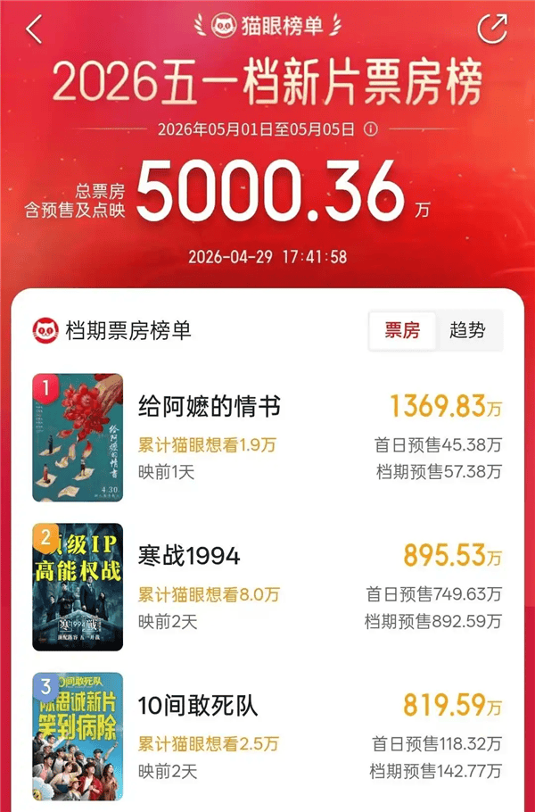 2026年4月29日,年度票房(含预售)突破129亿元;五一档新片预售破5000万元,形成“温情黑马+港片王牌+喜剧阵容”三强格局。