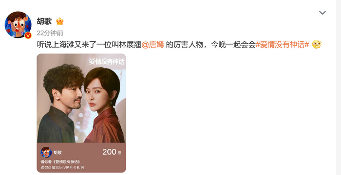 【#胡歌云包场支持唐嫣新剧# 】#胡歌宣传爱情没有神话# 29日,@胡歌 发文宣传@唐嫣 新剧《爱情没有神话》:“听说上海滩又来了一位叫林展翘@唐嫣 的厉害人物,今晚一起会会。”