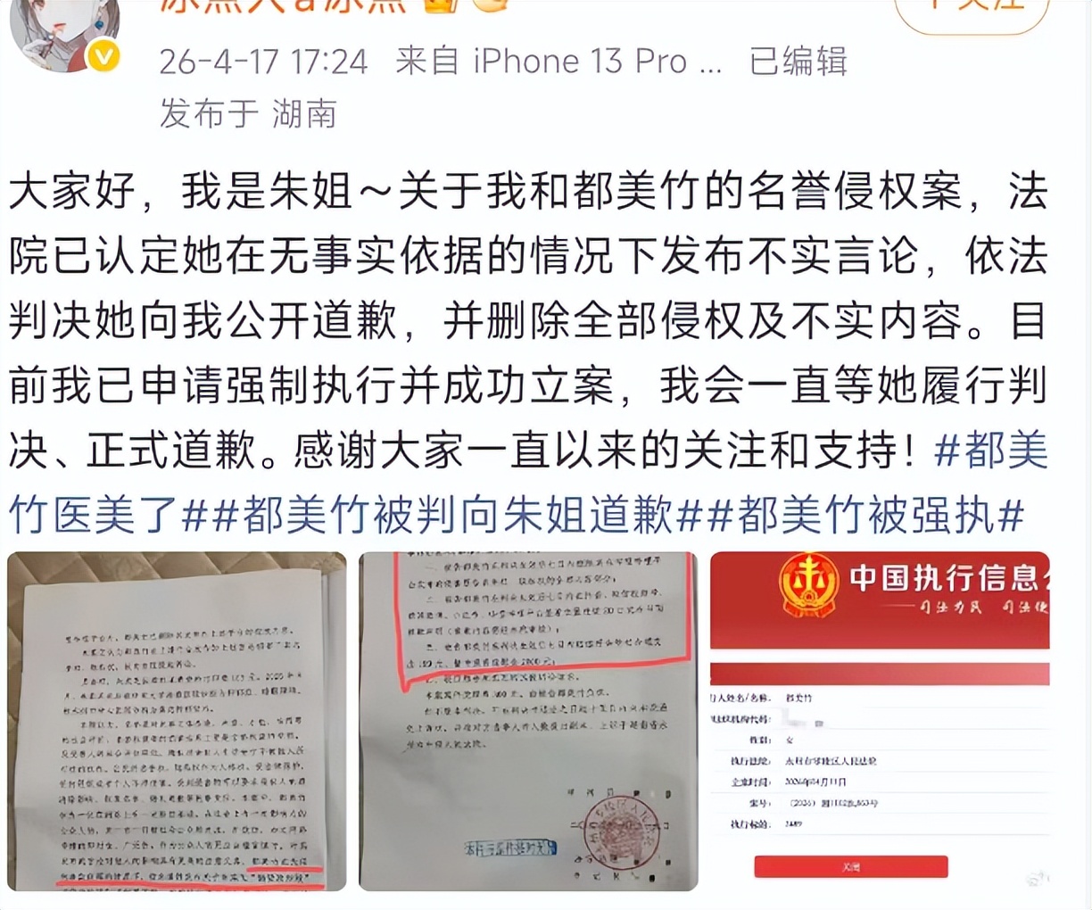 法院判决,都美竹败诉,删除所有侵权内容,置顶道歉30天,并赔偿朱姐2489元。