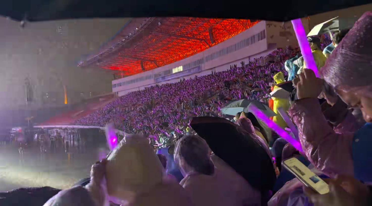 台下上万观众瞬间沸腾,高举荧光棒在滂沱大雨中集体跟唱,紧接着《我是女生》《向前冲》旋律接连响起,整个雨夜秒变露天万人蹦迪现场。