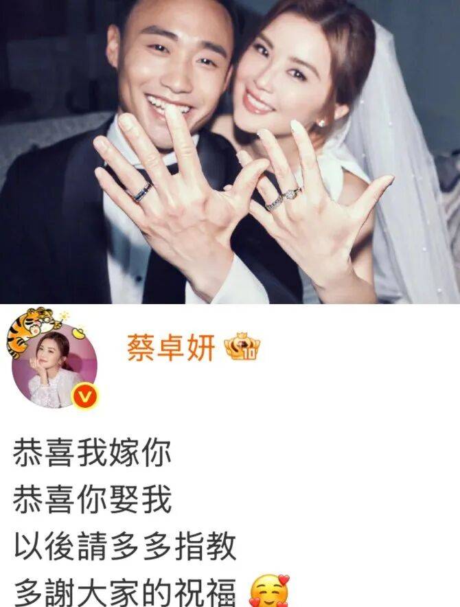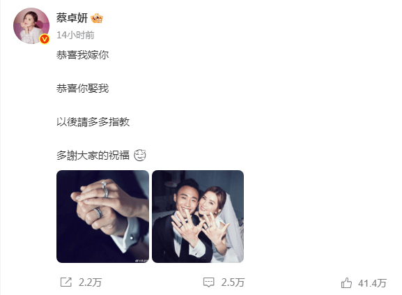 阿SA配文写道:“恭喜我嫁你,恭喜你娶我,以后请多多指教,多谢大家的祝福!”