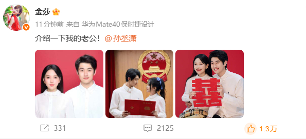 4月9日,金莎在微博晒出与孙丞潇结婚照,官宣两人结婚消息。