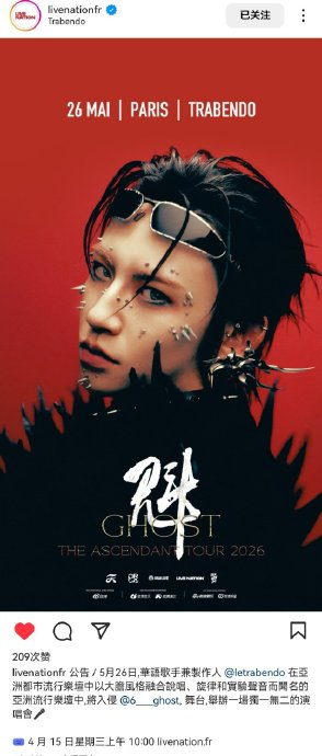 小鬼王琳凯(Lil Ghost)2026年「GHOST THE ASCENDANT TOUR」全球巡演欧洲站门票正在火热销售中,部分场次普票尚有抢购机会,而VIP票因稀缺性已基本售罄。