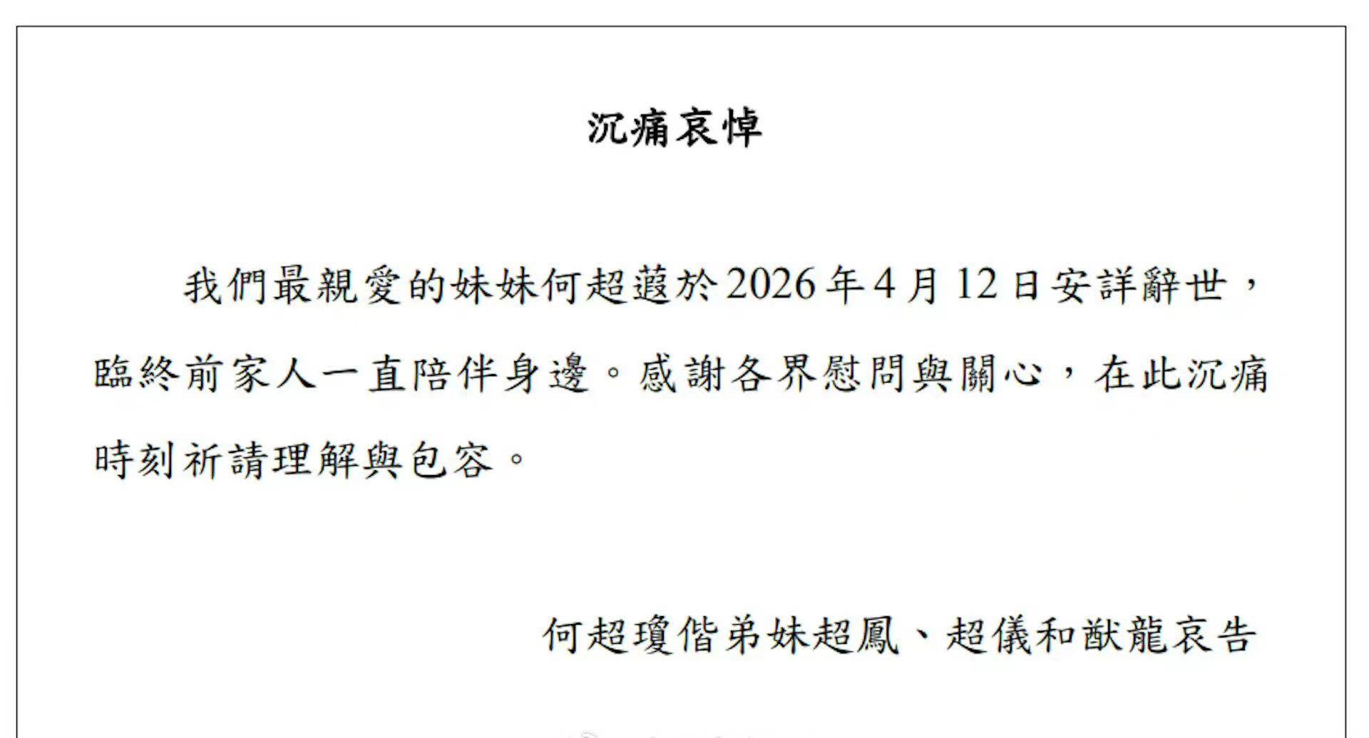 何超琼携弟妹发讣告,妹妹何超蕸于2026年4月12日安详离世,临终前家人一直陪伴身边,感谢各界慰问与关心,在此沉痛时刻祈祷理解与包容。