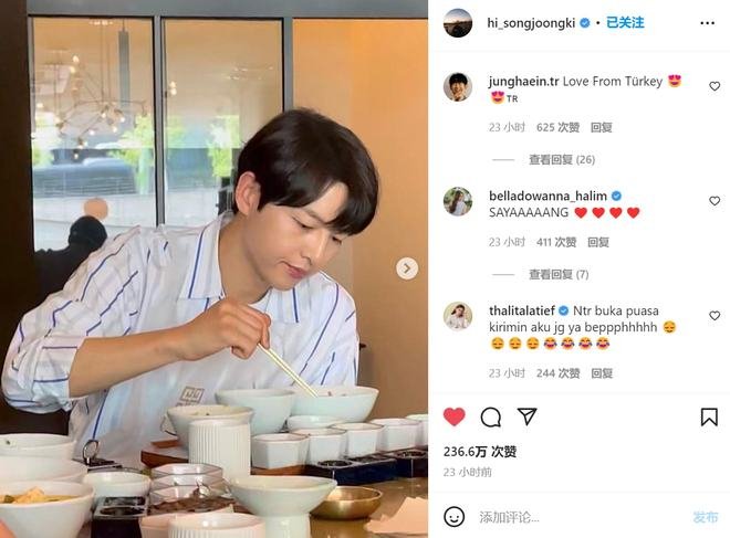 4月24日晚,韩国知名男演员宋仲基通过个人社交账号分享了日常吃饭照,虽然只是单纯晒照没有配文,但还是吸引来了大量影迷在评论区留言问候,纷纷表示宋仲基拍戏辛苦了,要多吃一点好好犒劳自己。