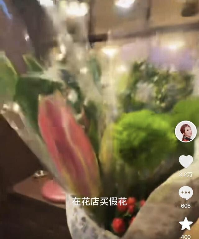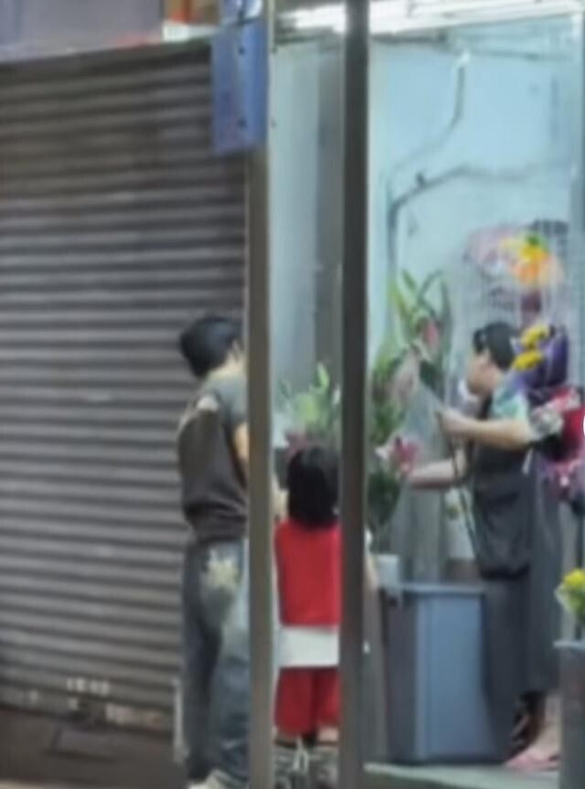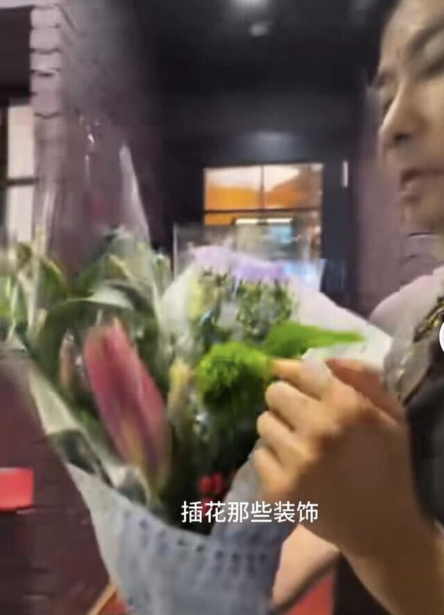 大女儿拿着手机在不远处拍摄,视频中的爸爸张晋带着小儿子在花店卖花,挑着花店里最好看的百合,让老板包好,张晋穿着一身短袖加牛仔裤,松弛感满满,小儿子则穿着大红色套装,活泼可爱。