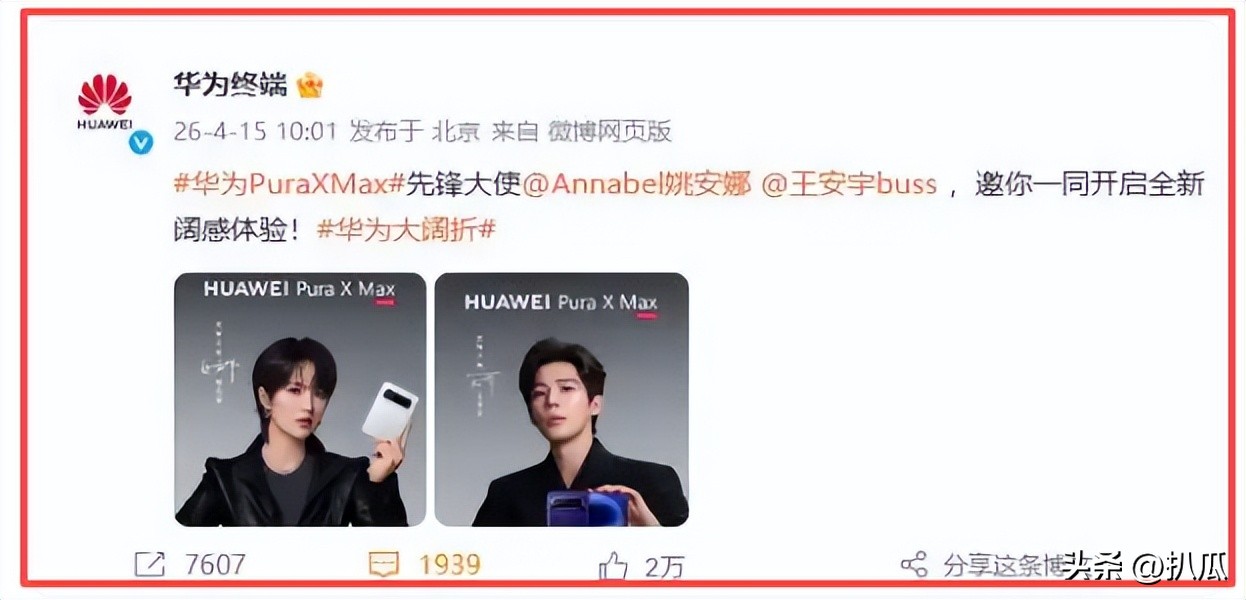 4月15日,华为发布最新动态:“先锋大使姚安娜和王安宇,邀你一同开启全新阔感体验。”