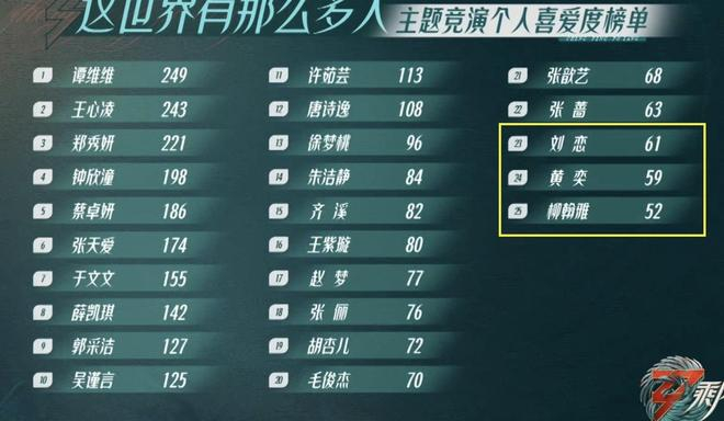 通过三公的排名,可以看出各位姐姐们的人气值,同时也能看出总排名并重要。因为淘汰的选手都是输了的队伍内排名靠后的人,也就是说即便姐姐们的排名都很靠前,只要队伍输了,那就势必会有人淘汰,不管她是第几名,同样的,即便姐姐在总排名是垫底的,只要队伍实力强,一样能躺赢到最后,所以个人喜爱度只能作为参考数据,并不能完全证明姐姐们的实力。