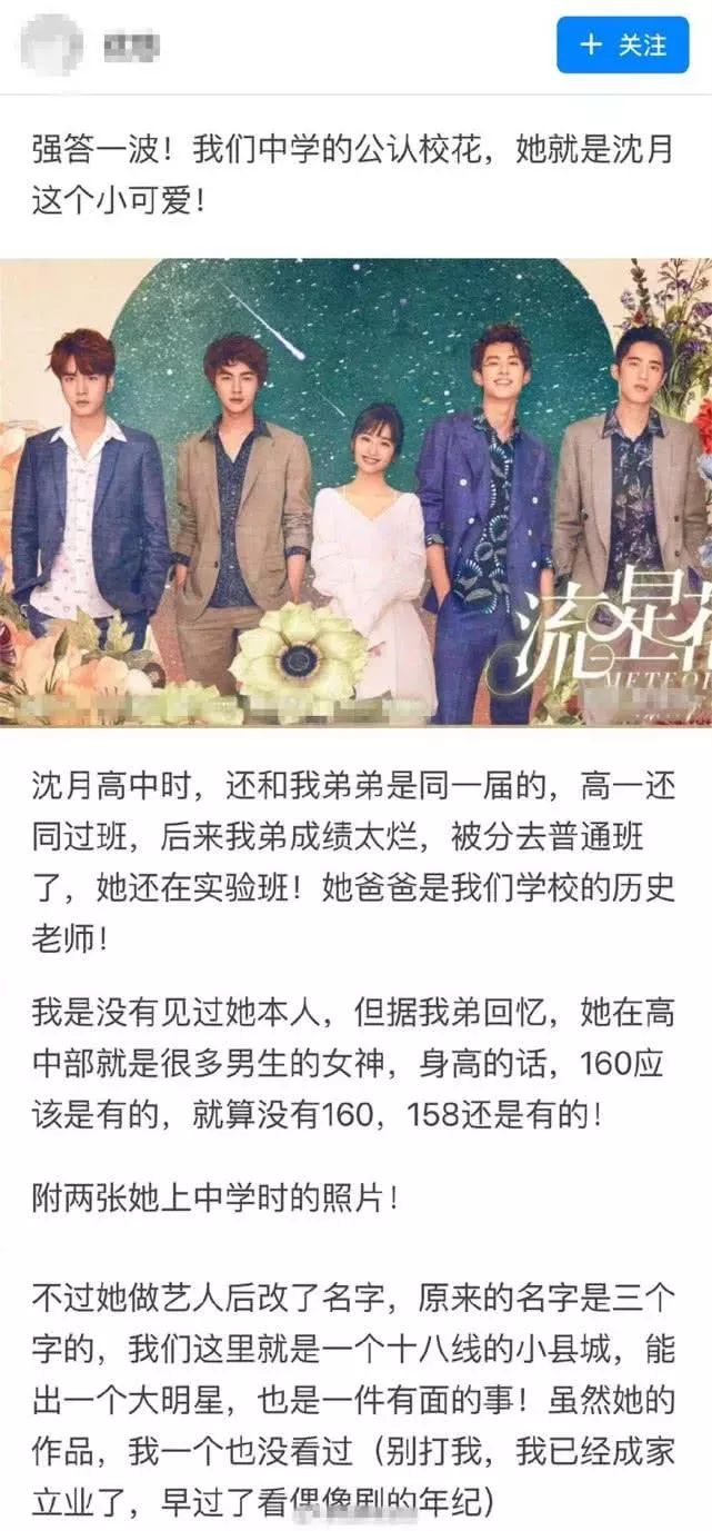 近日,一位自称是沈月高中校友的网友在社交平台上爆料,称沈月是他们中学公认的校花,也是很多男生心中的女神,和自己的弟弟是同届还同过班,并表示沈月成绩很好,一直在实验班。该网友还为沈月澄清身高:就算没有一米六,一五八还是有的!可见,在校友心中,沈月身高不矮而且很优秀。