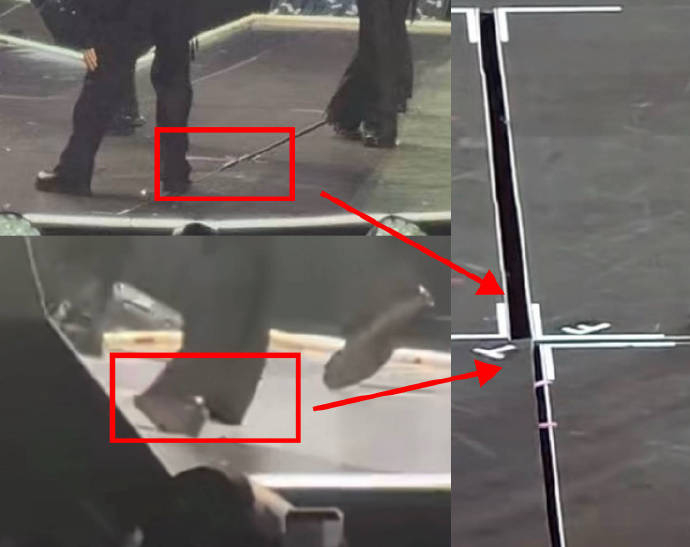 当晚RIIZE表演热门曲目《Boom Boom Bass》时,将太郎在完成高强度舞蹈动作时右脚意外踩入舞台接缝处。现场粉丝拍摄的视频显示,舞台相邻板块之间存在明显缝隙(目测宽度足以卡住鞋跟),且部分区域存在高度差。这一结构性缺陷导致他在跳跃落地瞬间失去平衡,脚踝呈不自然扭曲。尽管将太郎强忍剧痛坚持完成表演,但退场时已无法独立行走,需由工作人员搀扶离场,且被目击“一瘸一拐”“反复揉按腿部”。