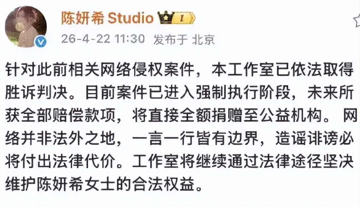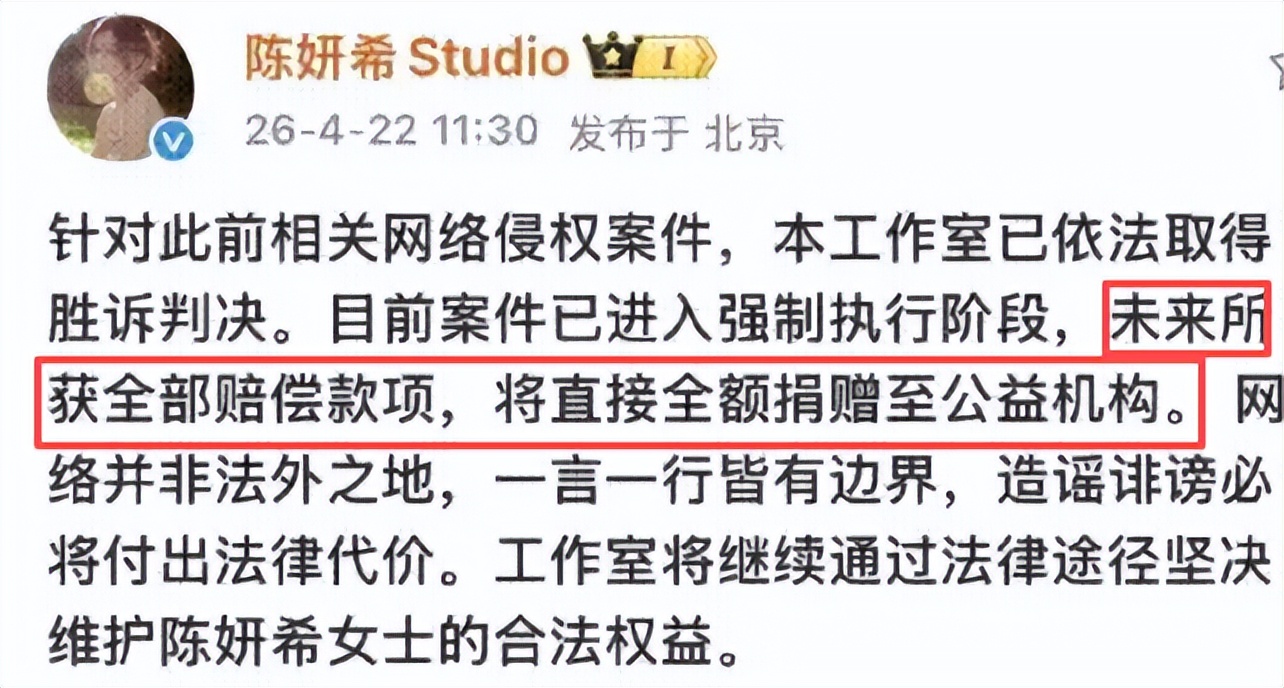 陈妍希也公开表态,这笔四万元赔偿她分文不取,将会全部捐献用于公益事业。