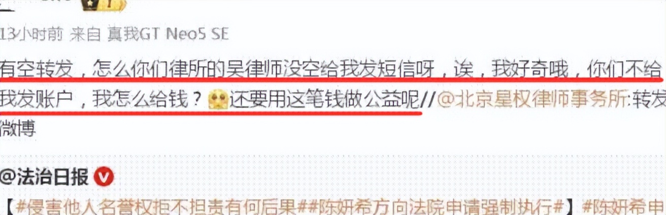而且在此期间,陈妍希方面的律师一直没有自己银行账户,他也不知道该怎么把赔偿款转过去。