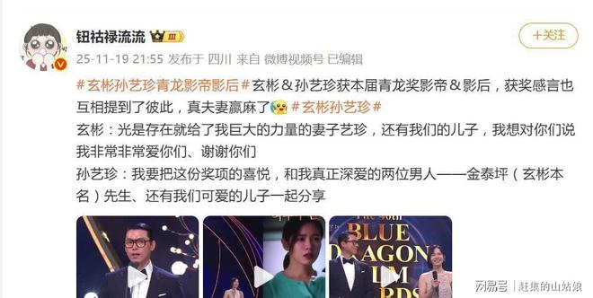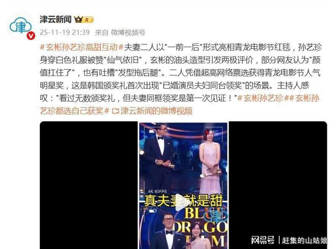 最戳人的莫过于获奖感言。玄彬直接致谢:“感谢作为我力量源泉的妻子艺珍,以及我们的儿子。”孙艺珍则甜蜜回应:“想与我最爱的两个男人——金泰坪(玄彬本名)和我们的儿子分享这份喜悦。”这隔空告白,直接把颁奖礼变成了大型撒糖现场。