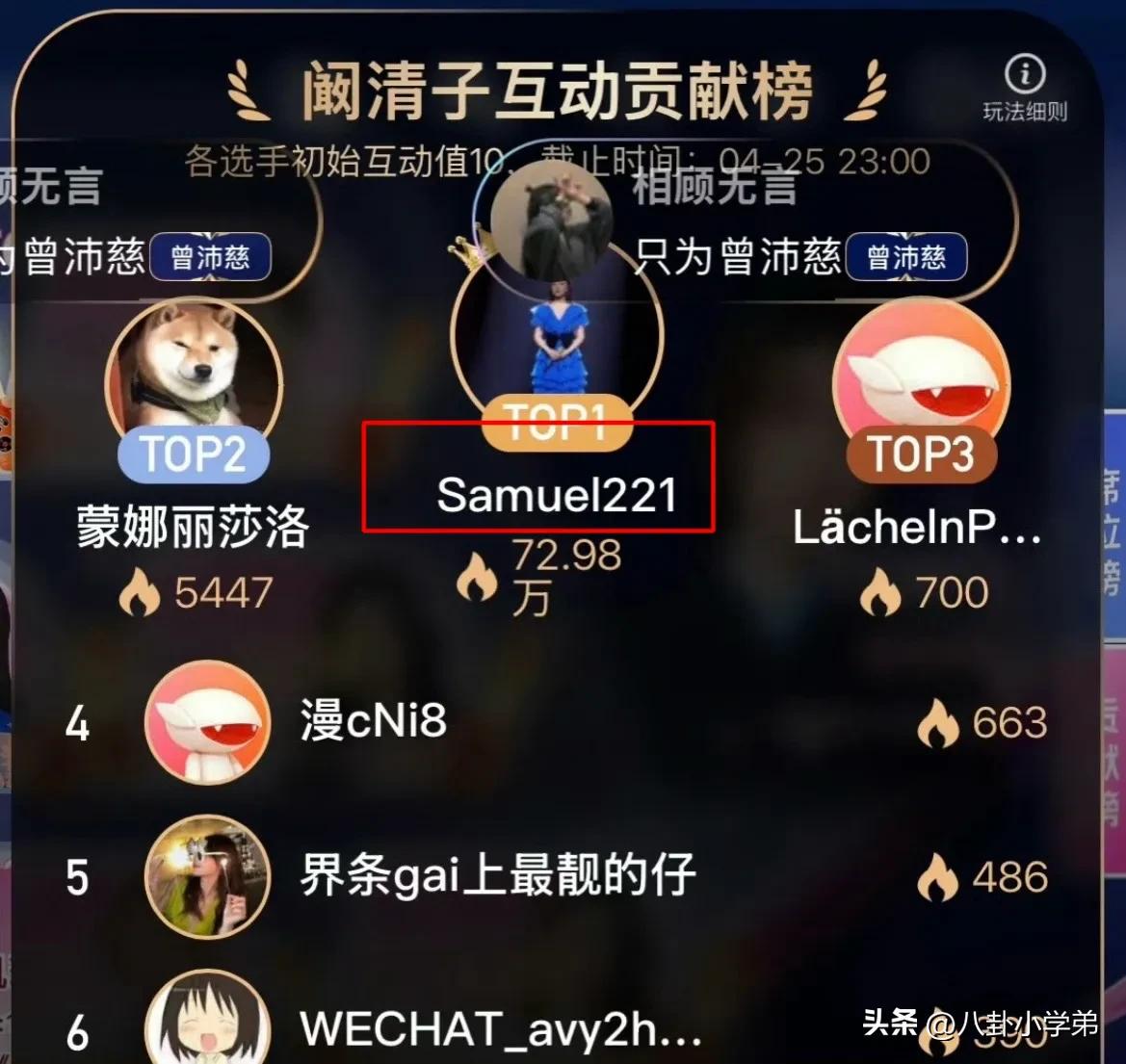 直播途中,别的姐姐的互动值都由粉丝为爱发电,到阚清子这,姐夫竟然使用钞能力,狂刷到榜一,将阚清子抬至第二名。