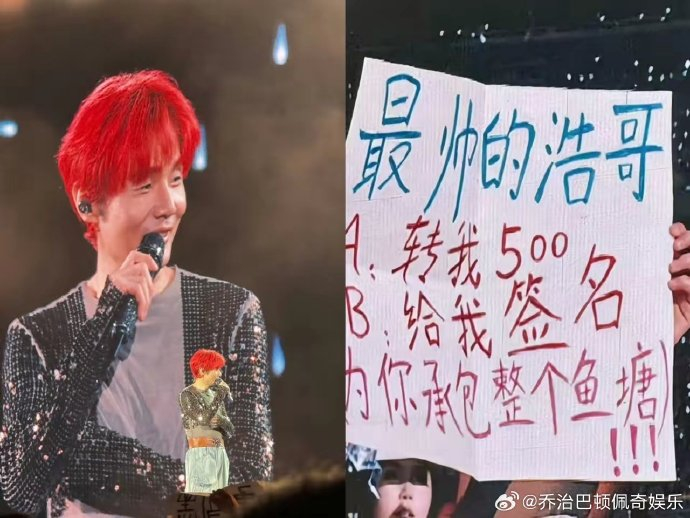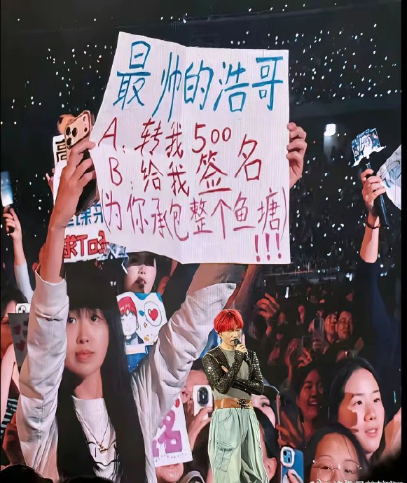 2026年4月12日李荣浩太原演唱会上,一位粉丝举着写有"最帅的浩哥:A.转我500 B.给我签名 承包整个鱼塘"的趣味灯牌,这个看似玩笑的互动竟在万众瞩目下演变成了全网热议的宠粉名场面。