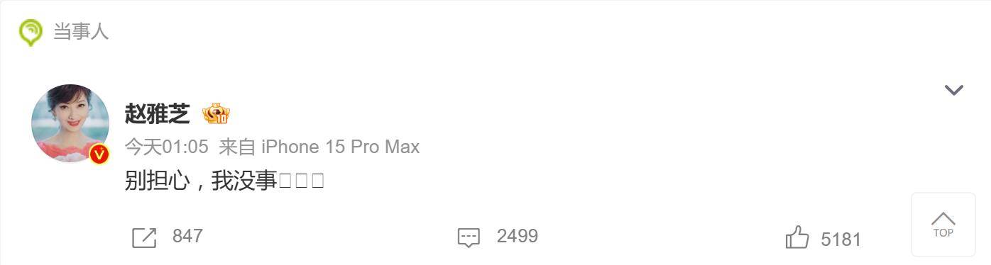 这惊险一幕迅速引发网络关切。事发后,赵雅芝于凌晨第一时间通过个人微博发文报平安,一句简短的“别担心,我没事”,安抚广大粉丝的担忧情绪。